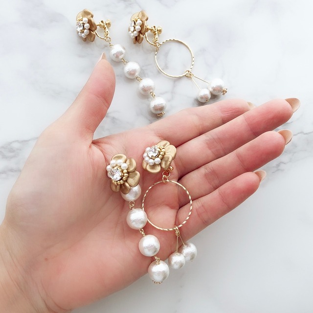 Amusant〜アミュゾン♪〜フランス語で楽しい♪♪という意味で付けました♪ シャランシャラン♪♪ゆ〜らゆら♪♪ 華奢なラインで主張し過ぎず、どんなシーンも合わせやすいデザイン♡ 金属部分は16金ゴールドコーティングの素材を使用し、きらめきが長持ちします♪ サイズ:全長約11cm 素材:国産コットンパール6mm、金属(K16ゴールドコーティング)、 ピアス:ステンレスフック イヤリング:真鍮 フープバネ式 お呼ばれ 大人 大人可愛い 結婚式 ウエディング ブライダル クリスマス 大ぶり ゴールドピアス ゴールドイヤリング バレンタイン 誕生日 ホワイトデー イベント 入学式 卒業式 入園 卒園