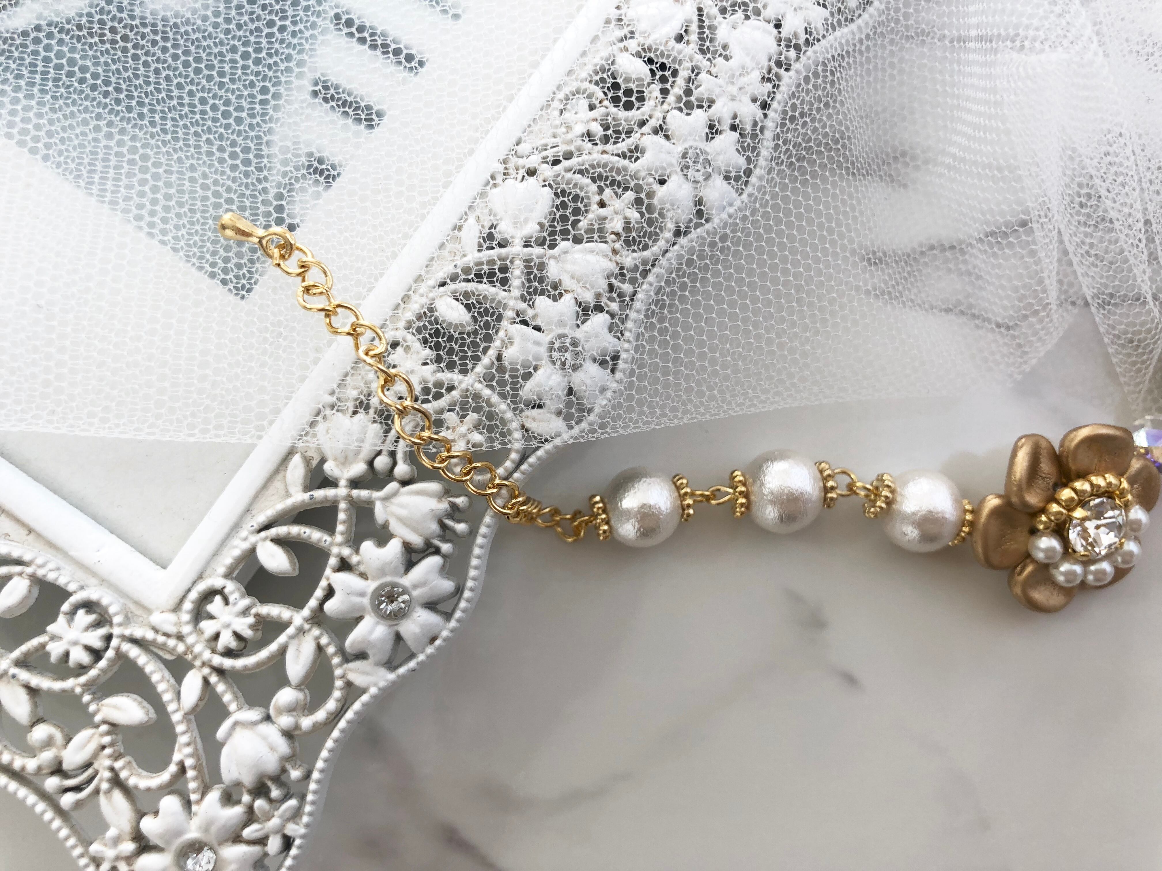 ○素材:スワロフスキークリスタル(ガラス)、チェコガラス、コットンパール(綿)、16金ゴールドコーティング金具、メタルビーズ