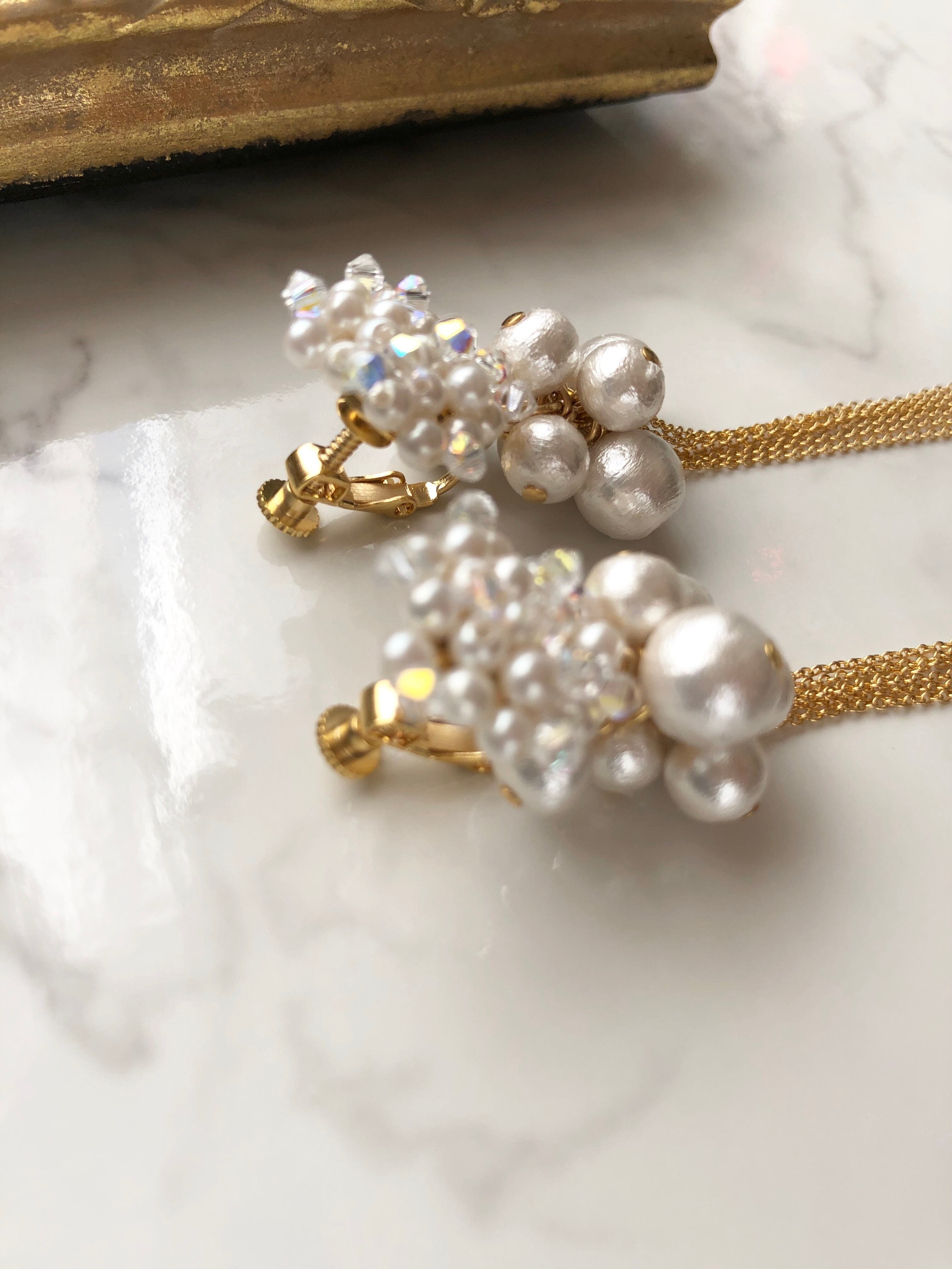 ウエディング、ブライダル、結婚式、お呼ばれ、二次会、成人式、卒園、卒業、入園、入学、大ぶり、タッセル、コットンパール、大人可愛い、クリスマス、バレンタイン、ホワイトデー、誕生日