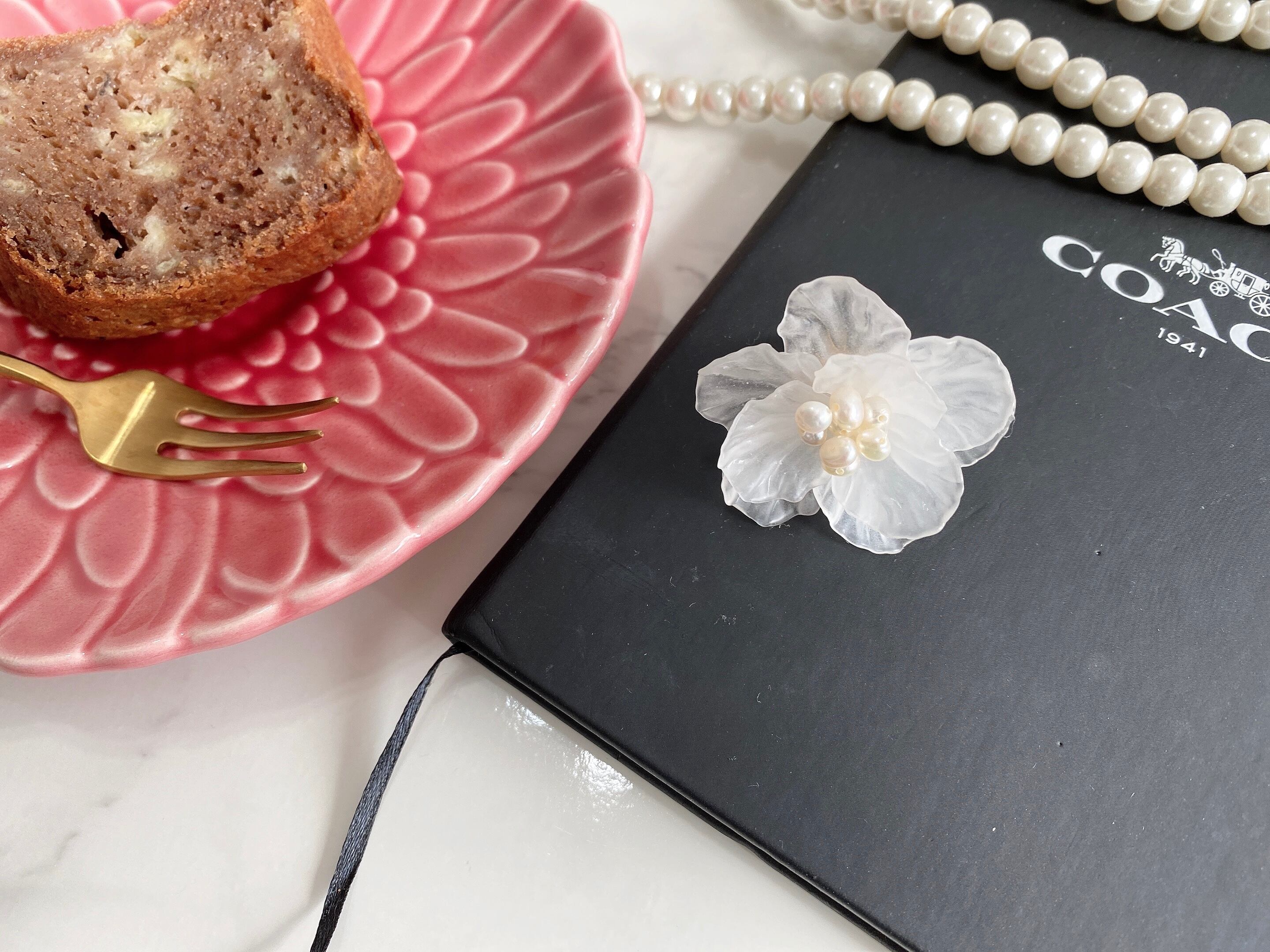 磨りガラスのような花びらのパーツをお花のモチーフに編み付け、中央の花芯部分は淡水パールを使用しています♪