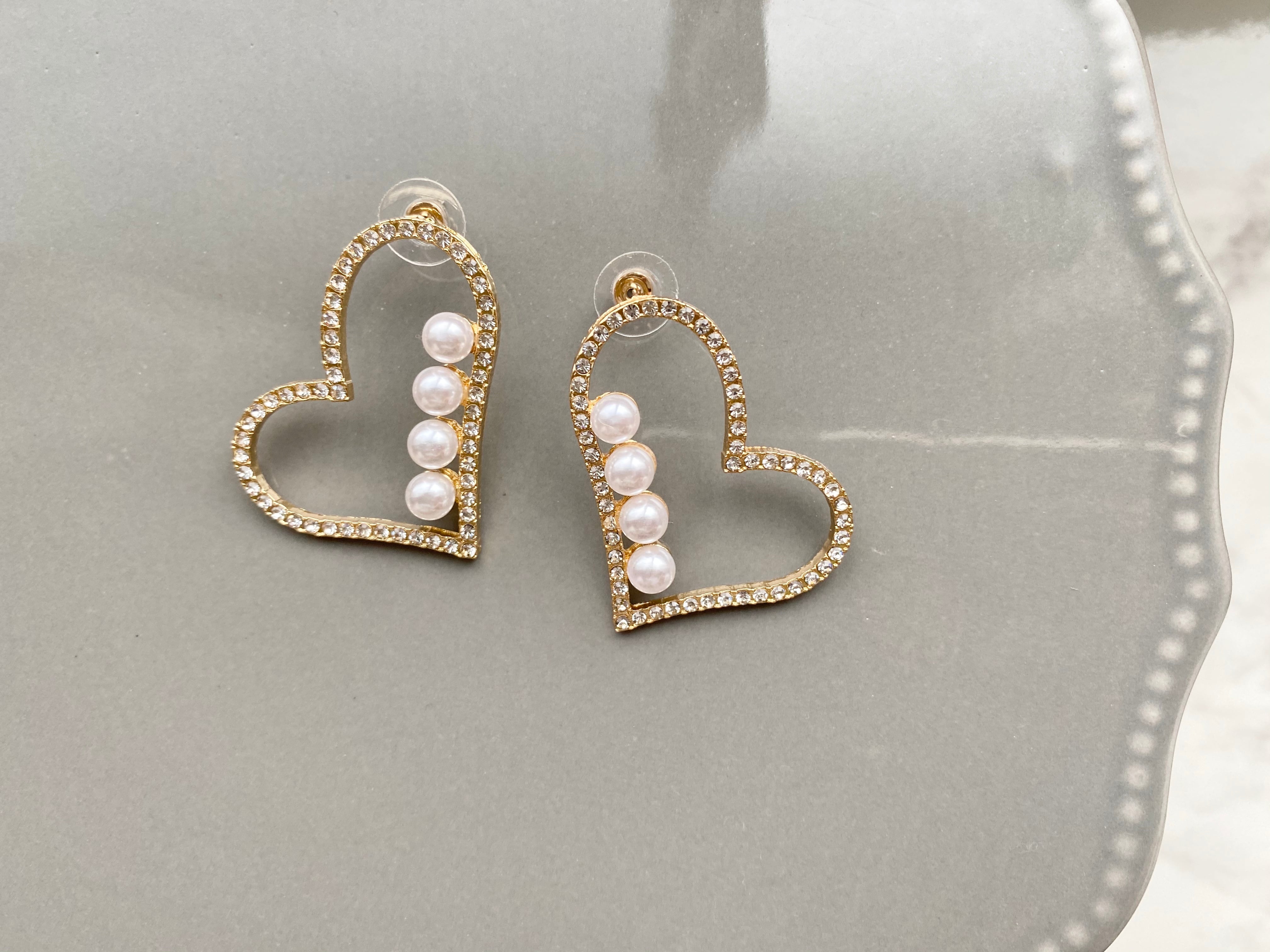 ハートの可愛さの中にもパールとラインストーンの上品さが加わり、"大人かわいい"ジュエリーに。