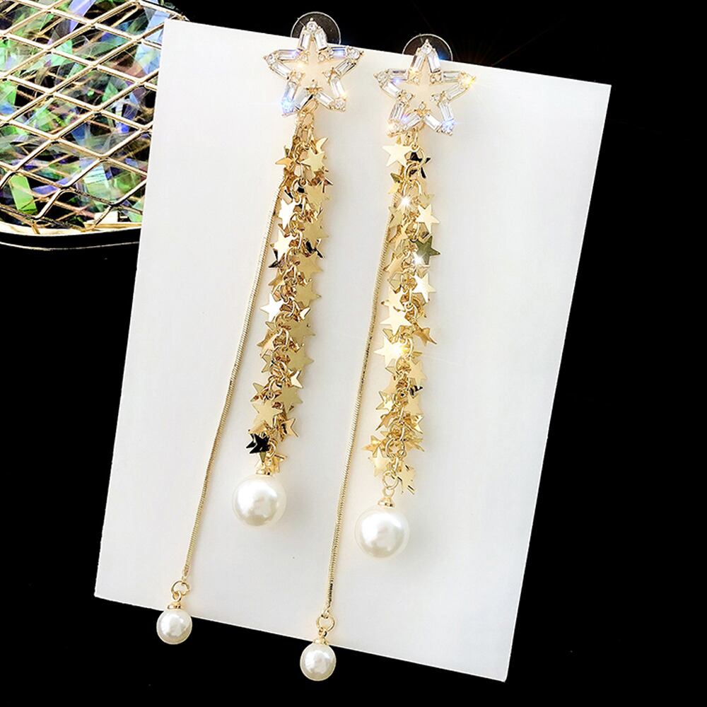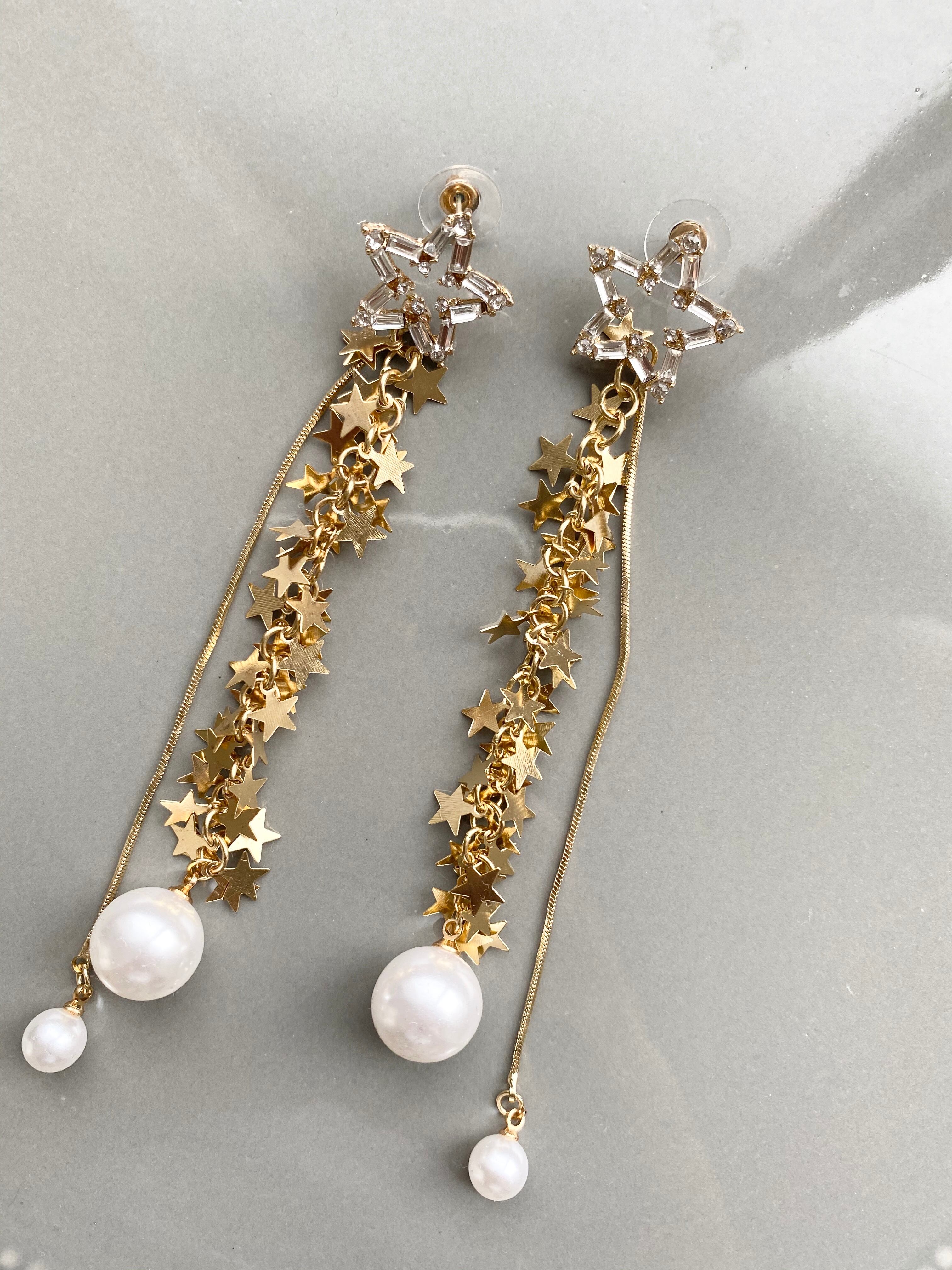 キラキラビジューの星モチーフにスターチェーンと大粒パールが揺れるロングピアス♪