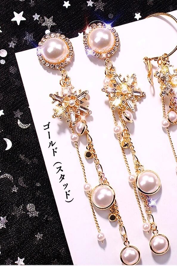 雪の結晶のようなゴージャスで美しいロングタイプのチェーンピアス!