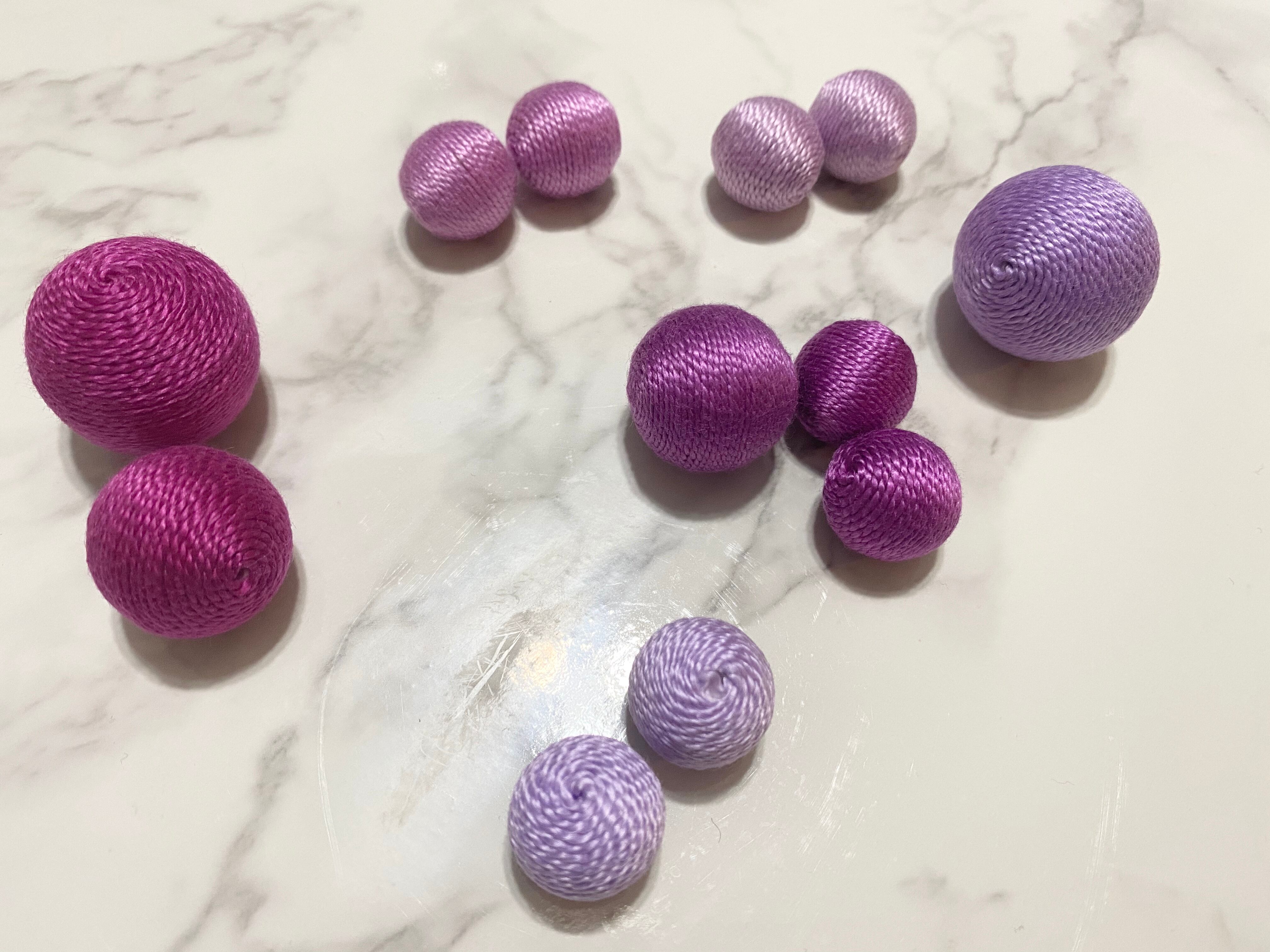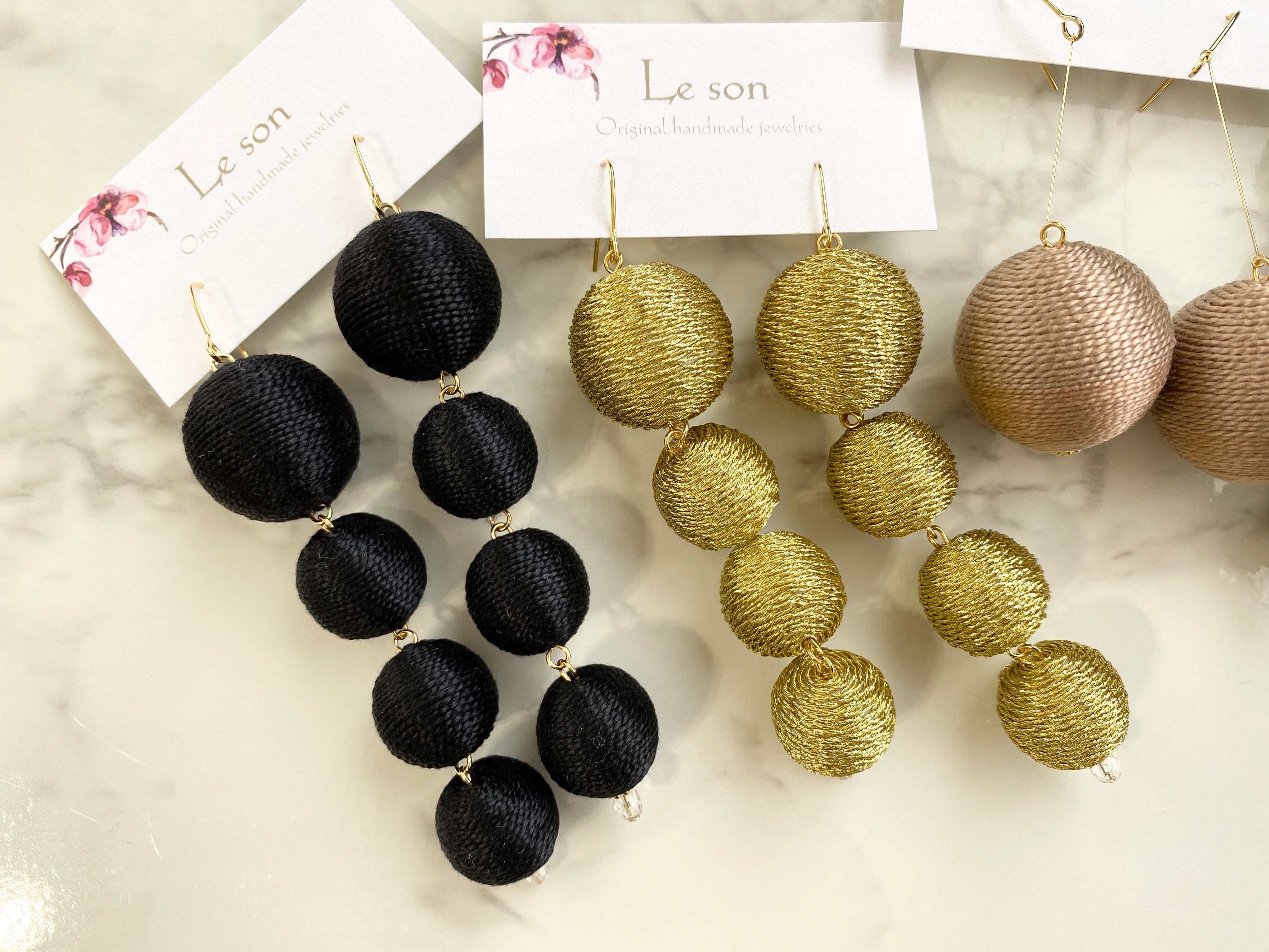 刺繍糸を使用した丸いモチーフを大小組み合わせた存在感のある耳飾りです。